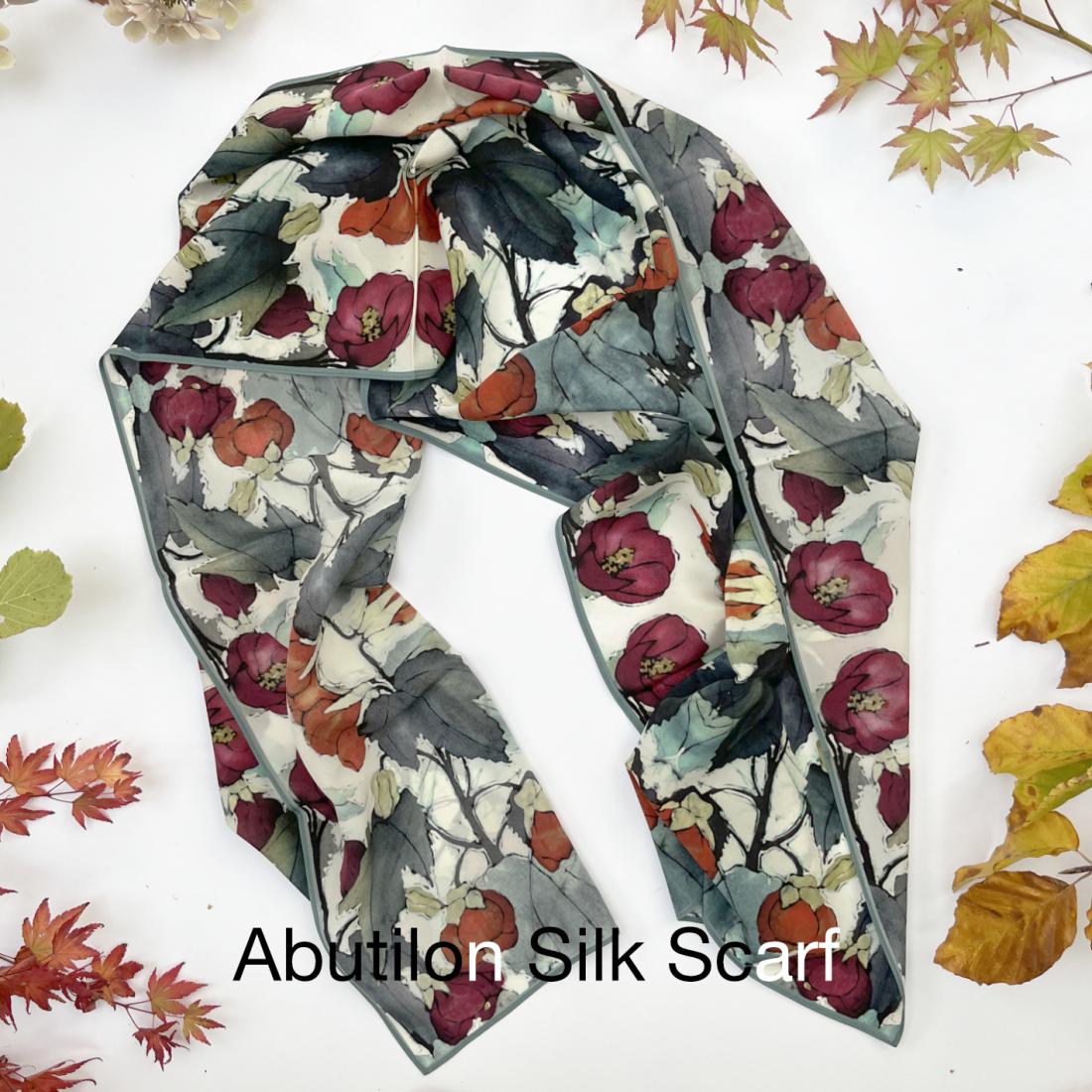 Red and orange flowers will add a pop of colour, while the soft greens would compliment a plain dark green coat or jacket. Silky soft and drapey, any age group could wear the Abutilon scarf.