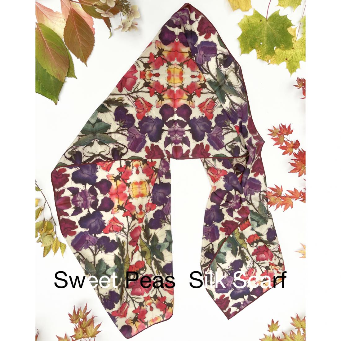 This is one of our beautiful new silk scarves slightly different to the previous Sweet Peas design. Digitally printed in the UK onto a slightly lighter weight of pure silk crepe de chine, the colours are a touch stronger and permeate the fabric so both sides of the scarf have the same colour values, also the hems are hand rolled. They are still generated from my original Batik paintings. I hope you like them.